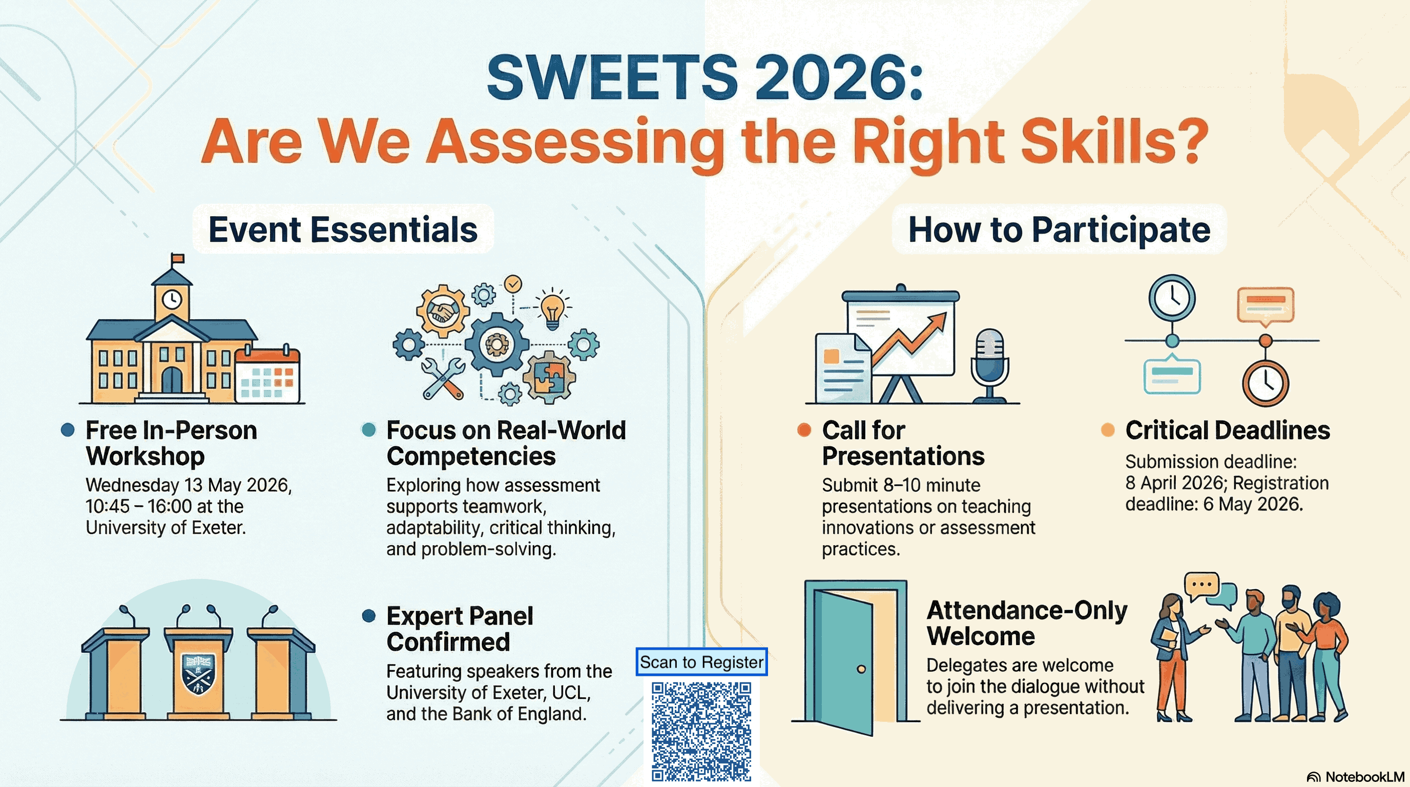 The annual SWEETS workshop is a 1-day workshop held at a Southwest institution to provide a space for all academic economists to discuss new teaching ideas and find new collaborators for scholarship projects. The theme for the 2026 Workshop is collaboration, learning, and work in the discipline of Economics in a changing world. We invite Economics educators, researchers, and industry professionals to engage in a dialogue on the future of assessment and its alignment with the realities of today’s rapidly evolving professional landscape. The event will explore how educational practices—from curriculum design to learning activities and assessment strategies—can better prepare students for the complex, dynamic environments they will encounter beyond university and effectively support the development of essential professional competencies such as teamwork, adaptability, critical thinking, and real-world problem solving.
