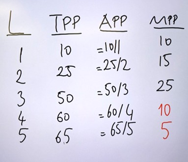 At this stage, I intentionally avoid using terms such as physical capital and limited availability of physical capital to simplify the scenario for students, as the activity itself already includes an element of physical capital, represented by the laptops. After this explanation, I move to the first student and tell them that they are the first staff member, who by the end of the task has typed ten pages. To demonstrate this, I draw a table on the whiteboard with columns labelled, from left to right, number of employees as L, TPP, APP, and MPP. After entering Labour (L) = 1 and Total Physical Product (TPP) = 10 in the table, I introduce the concept of Average Physical Product (APP). I explain to the class that it is calculated like any other average value, by dividing the total output by the number of workers, that is, APP = TPP / L.