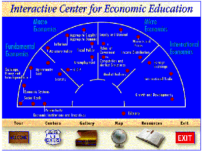 There are four "rooms that may be visited: One dealing with topics related to fundamental economics principles; A second dealing with Macroeconomic related issues; while the third permits the student to look at Microeconomic related issues; and the fourth confronts questions relating to International matters, such as Trade, foreign exchange, and growth and development. The user can also jump to the "library" resources on the CD from this "route" map as well as from the "gallery".