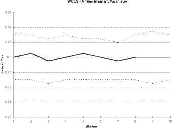 Similar evidence can be displayed through Ordinary Least Squares based upon a window of observations (WOLS). In this case also, we begin with a sub-sample of our total data set. We calculate OLS estimates given this sub-sample. In order to examine the stability of these estimates, we slide this window across the entire sample, adding one observation and taking one away (Spanos, 1986). In this case, the number of observations utilized to calculate the parameters remains constant, as opposed to ROLS where the number of observations increased in each successive iteration.