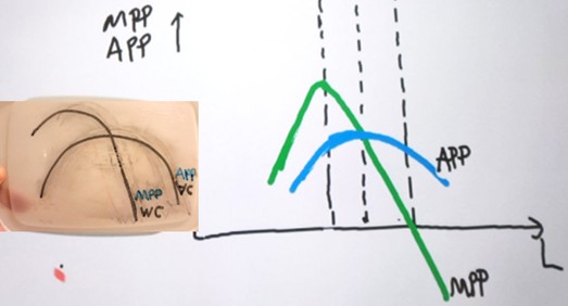 After everyone completes their drawing, I show my version drawn on the semi-transparent lid. At first, the students appear curious but unsure about its purpose. Then, I flip the lid upside down and hold it next to the APP and MPP diagram on the whiteboard (See Figure 4). They immediately notice that my smiling face illustration, along with the MC curve, matches the diagram on the board once it is flipped. At that moment, the connection becomes clear, and students realise that the two drawings share the same shape, visually reinforcing the inverse relationship between productivity and cost.