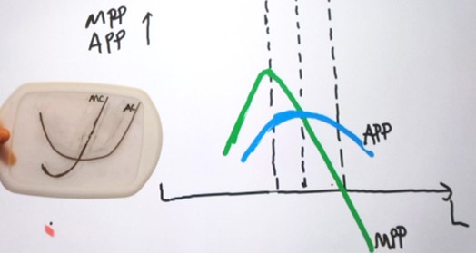 I then link this understanding to Average Physical Product (APP) and Average Cost (AC), explaining that these two curves move in opposite directions, effectively behaving as mirror reflections of one another. Any change in Average Physical Product (APP) is reflected in the opposite direction by Average Cost (AC). The same principle applies to Marginal Physical Product (MPP) and Marginal Cost (MC).